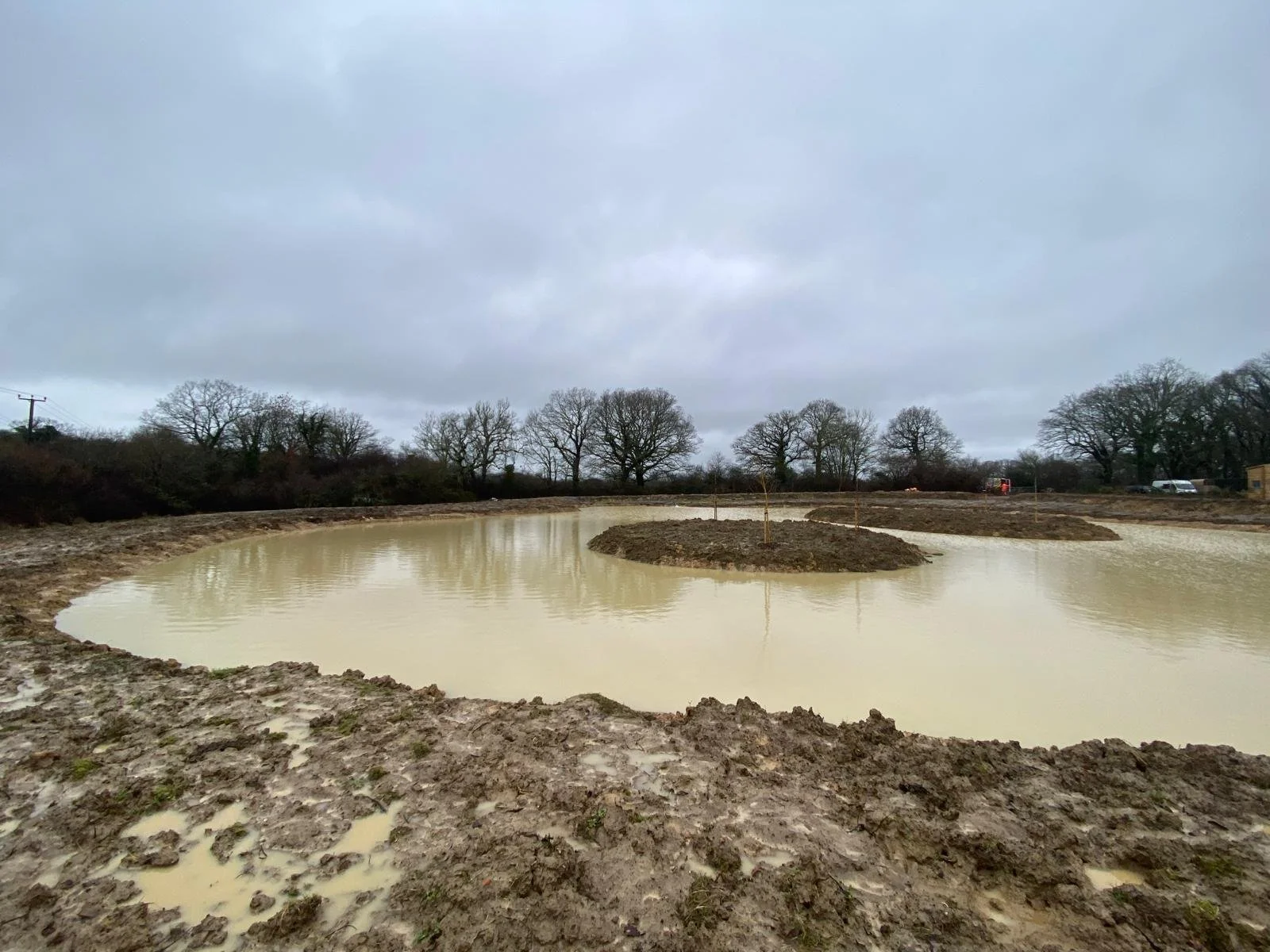 We dug our lake in November 2025 - December 2025 and it filled with the amount of rainfall we had by the end of January 2026. We have spent the remainder of the winter planting a hedgerow around the lake and we are looking forward to further landscaping once the ground has dried and we can spread the wildflower seed.